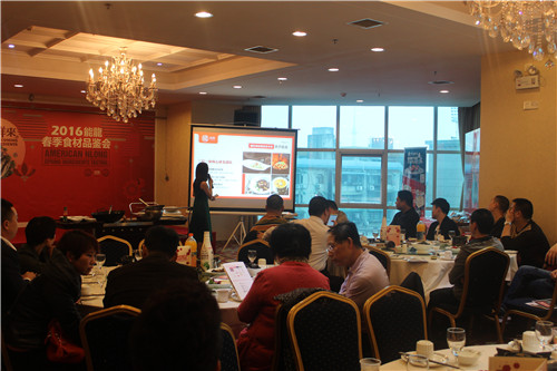 活动以能龙的品牌宣讲正式拉开帷幕。主持人从能龙的品牌发展历程、能龙目前的合作客户及企业定位三方面为客户简要描绘了能龙的企业面貌。紧接着对公司目前主推产品进行介绍,从鱼类、虾类、贝类、参类等多条产品线为客户展示能龙产品,并对当天品鉴的食材进行了重点的介绍。宣讲的最后一节是由湘菜产业促进会秘书长陈敬女士发言。陈秘书长代表湖南餐饮界对能龙表示欢迎与肯定,肯定了能龙全球采购的优势,并表示食材的引进与丰富更有益于湘菜在更大范围内的推广。