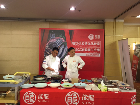 针对此次沟通会,能龙也进行了充足的筹备。不仅准备了多款精致菜品参展,对现场展台及周边物料也进行了精心的布置。活动议程中,能龙市场部薛肖肖对公司发展情况、企业定位和能龙产品进行了热情专业的宣讲,获得了阵阵掌声。随后的菜品品鉴环节中,能龙厨务部为本次活动精心烹饪的九道美食,分别是藤椒小鲜鱿、仔姜芽爆炒小鲜鱿、酸汤龙利鱼、生灼龙利鱼片、葱烧小乌参、麻辣来凤鱼、香煎带皮龙利鱼块、雪菜笋丝美人鲽、香煎秋刀鱼。这九道美食不仅造型精致可人,味道更是让不少参观者赞不绝口。
