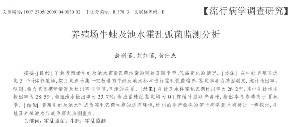 黄昌和等在《中国热带医学》杂志中也发表了关于牛蛙及养殖池中的霍乱弧菌检测,从624分样品中检出弧菌率为8.17%,弧菌检测CT(霍乱肠毒素)均为阴性,表明牛蛙中检测出的霍乱菌株均属于非致病非流行株,不会引起霍乱流行病。