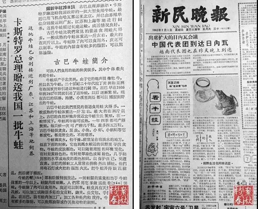 《人民日报》报道古巴总理赠送我国牛蛙(左)