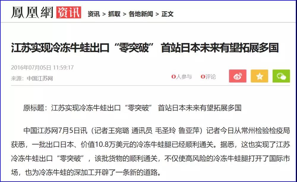 江苏也早已开启了牛蛙出口之路