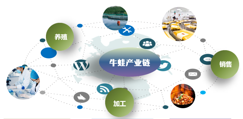 完整的产业链配套是牛蛙产业稳步发展的根基,从苗种繁育、养殖、饲料生产、成蛙流通销售到成蛙加工都非常成熟。